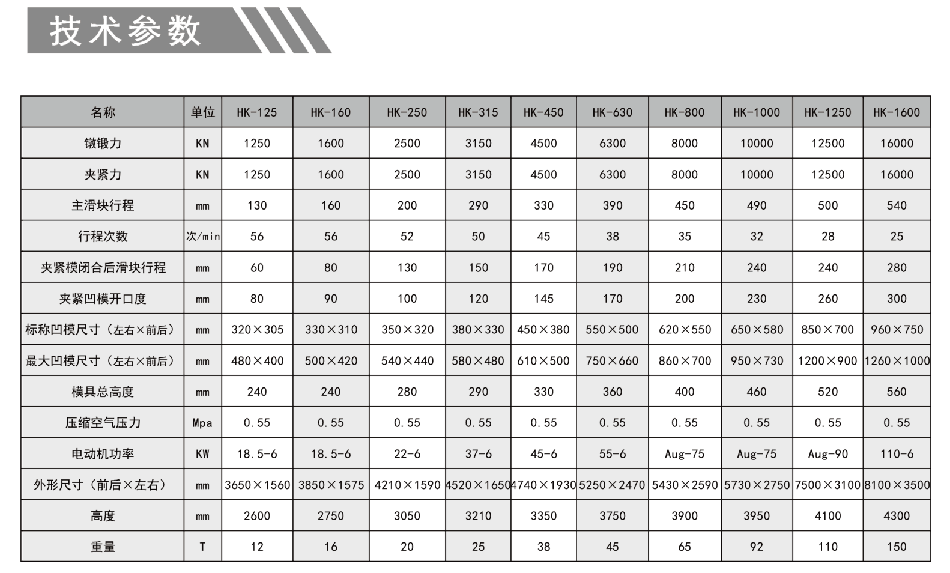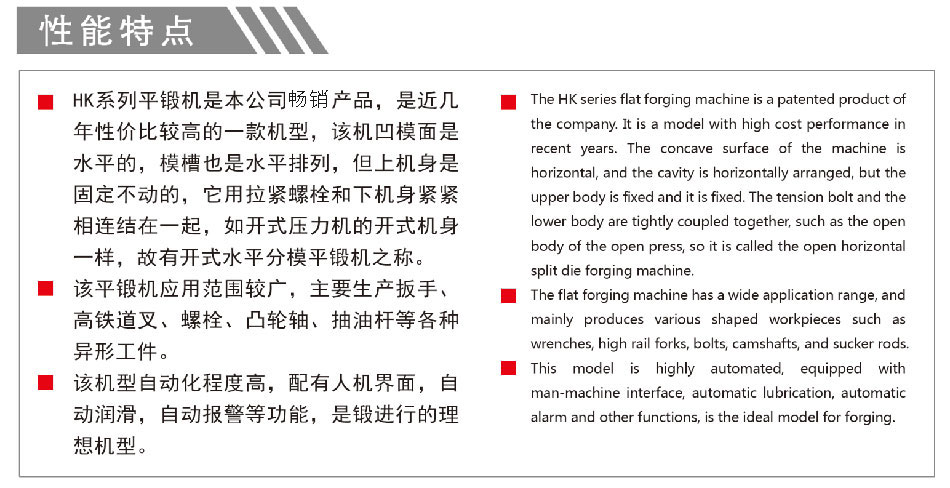 HK系列平鍛機,是近幾年性價比較高的一-款機型,該機凹模面是水平的,模槽也是水平排列,但上機身是固定不動的,它用拉緊螺栓和下機身緊緊相連結(jié)在一-起,如開式壓力機的開式機身-樣,故有開式水平分模平鍛機之稱。該平鍛機應(yīng)用范圍較廣,主要生產(chǎn)扳手、高鐵道叉、螺栓、凸輪軸、抽油桿等各種異形工件。